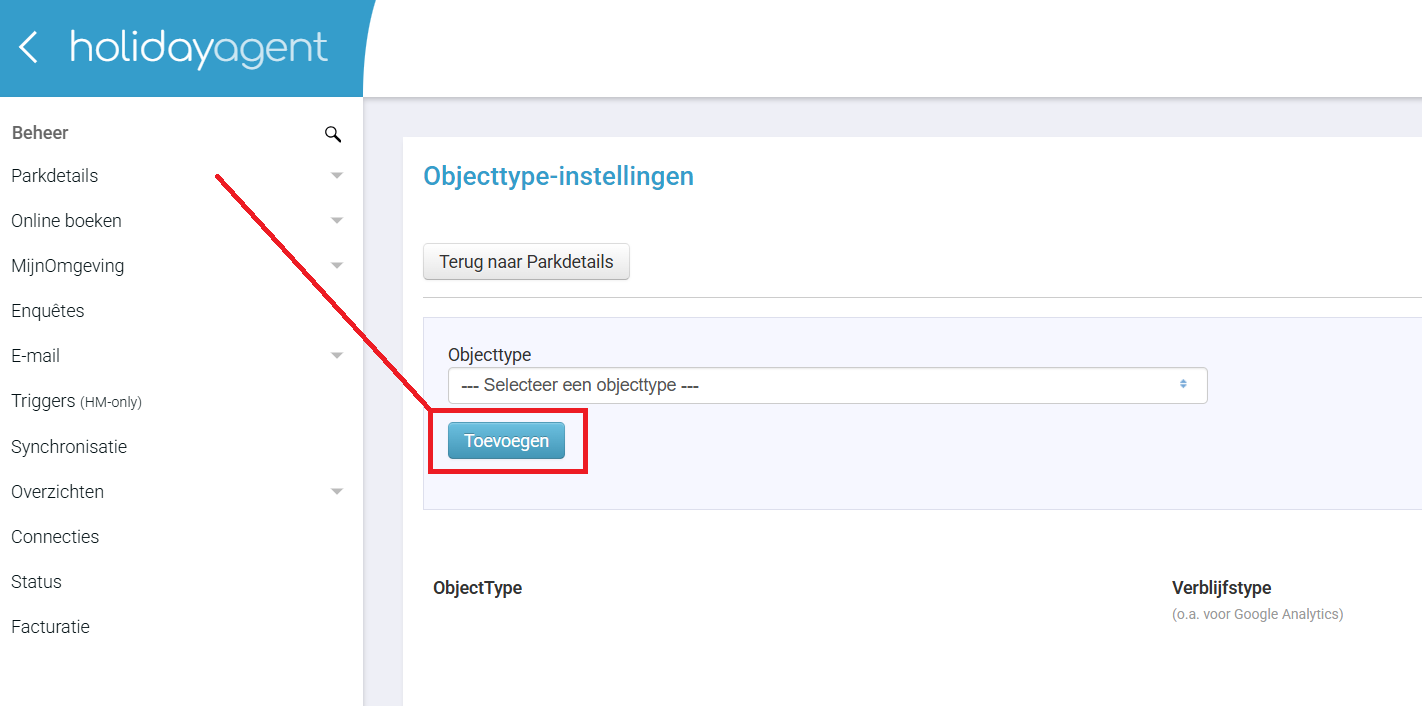 - Ga na inloggen in het CMS via Parkdetails naar Objecttypes.