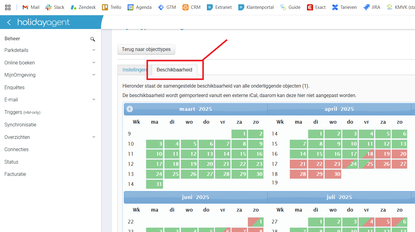 Het objecttype is nu aangemaakt, het tabblad Beschikbaarheid is nu ook beschikbaar gekomen bij het objecttype. Wanneer u gebruik maakt van een iCal link wordt de beschikbaarheid automatisch hier bijgewerkt. Zonder iCal link kunt u de bezetting handmatig bijhouden door op de kalender te klikken en beschikbaar of niet beschikbaar te selecteren bij een periode.