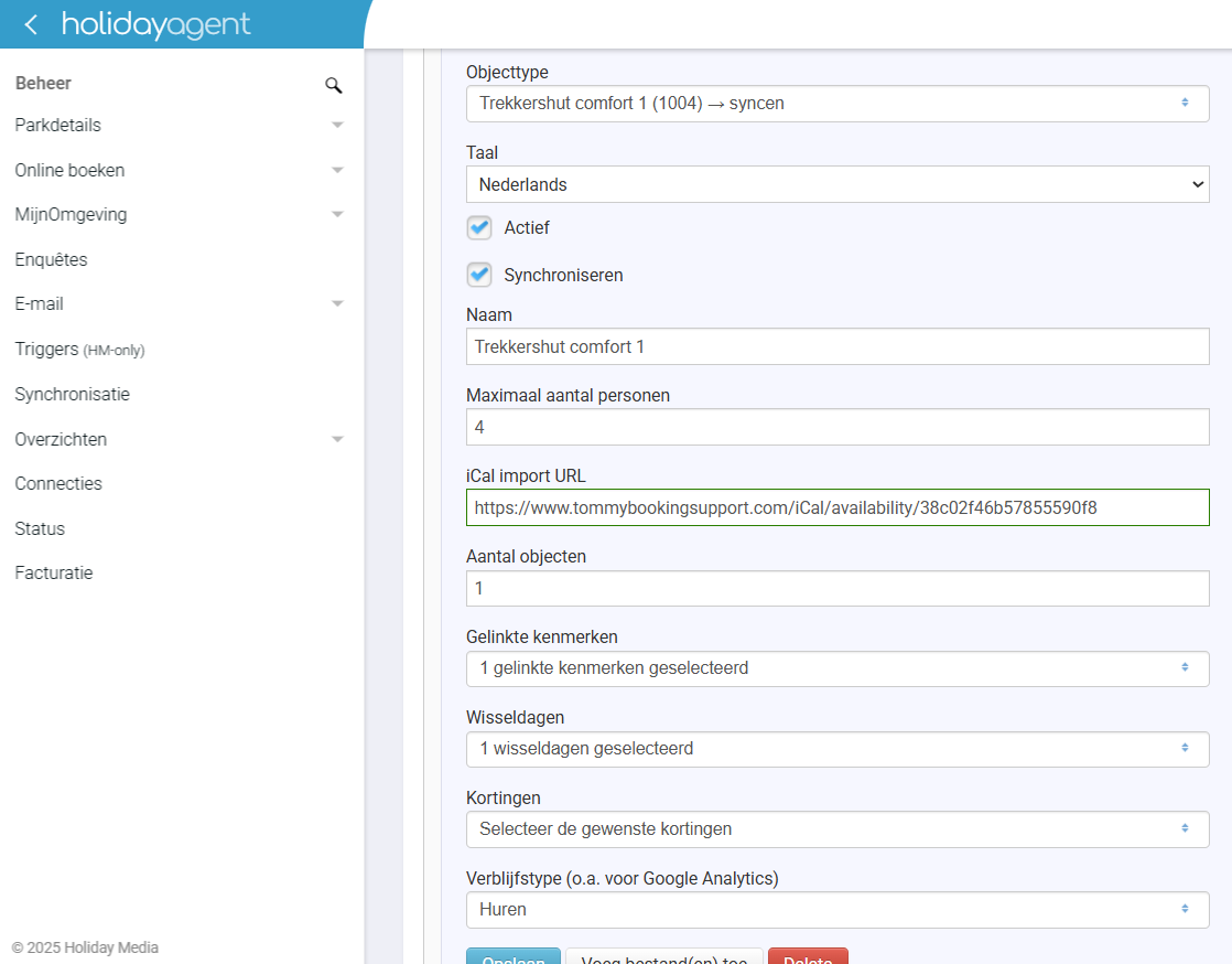 Heeft u meerdere iCal linkjes beschikbaar, maak dan per iCal link een objecttype aan in HolidayAgent. Een iCal link kan de beschikbaarheid van één of meerdere objecten bevatten. Geef bij het instellen aan (Stap 1 - 3.6 Aantal objecten) hoeveel objecten de iCal link bevat. -