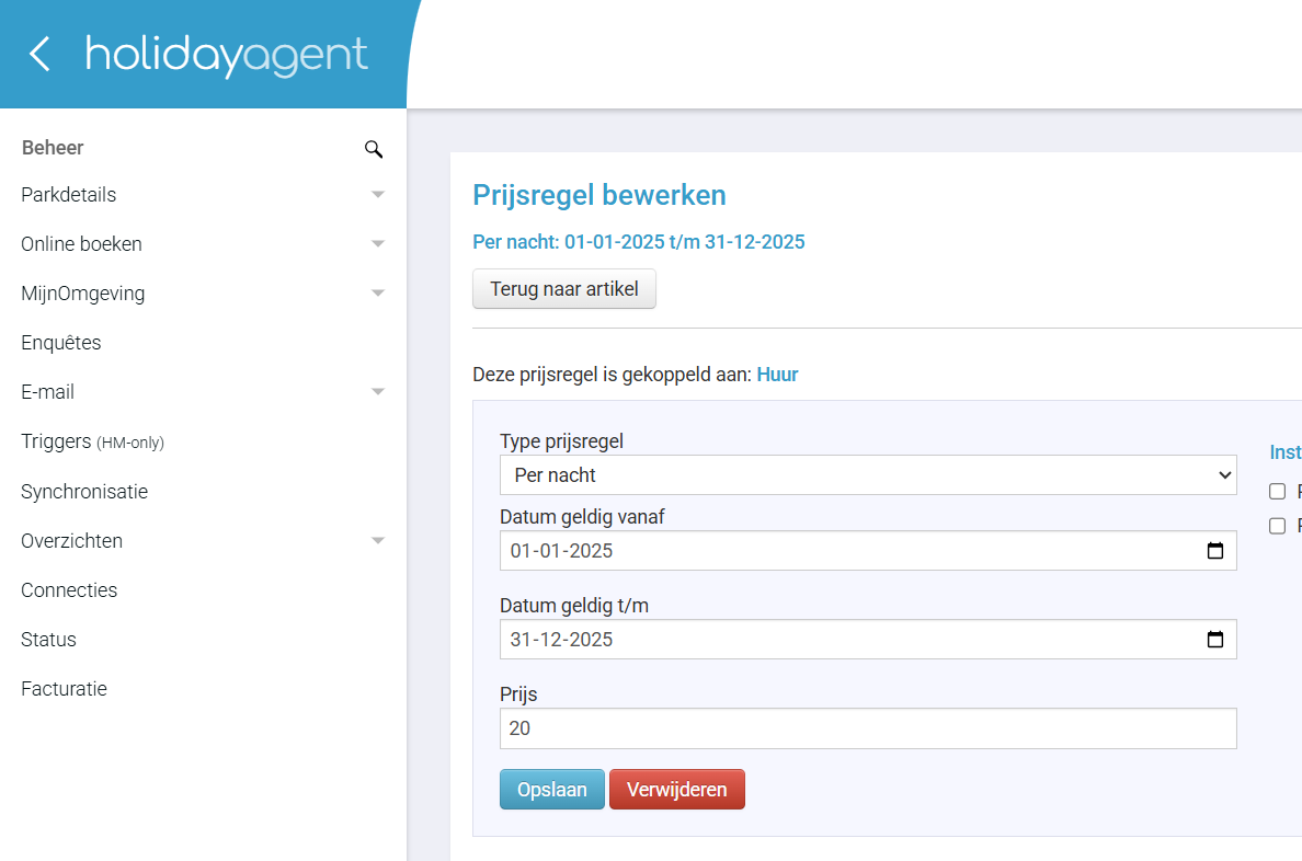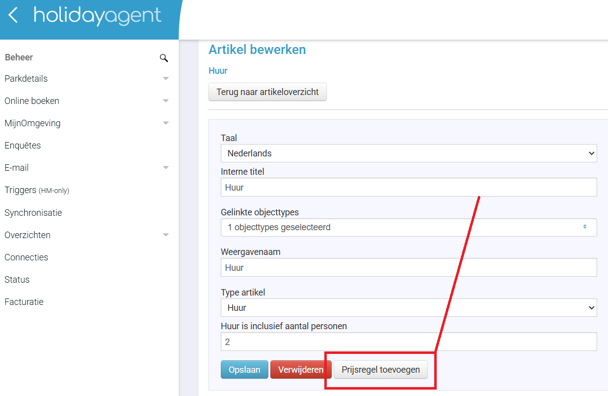 Naast het normale huur artikel is het ook mogelijk om extra artikelen als bijvoorbeeld Toeristenbelasting toe te voegen aan de kassabon. Dit doet u door een extra artikel aan te maken in HolidayAgent met als type Overig. Specifiek voor toeristenbelasting kunt u bij het instellen van de prijsregel het vinkje Prijs per persoon/huisdier (categorie) aanzetten. Optioneel bijboekbare artikelen zijn niet mogelijk.