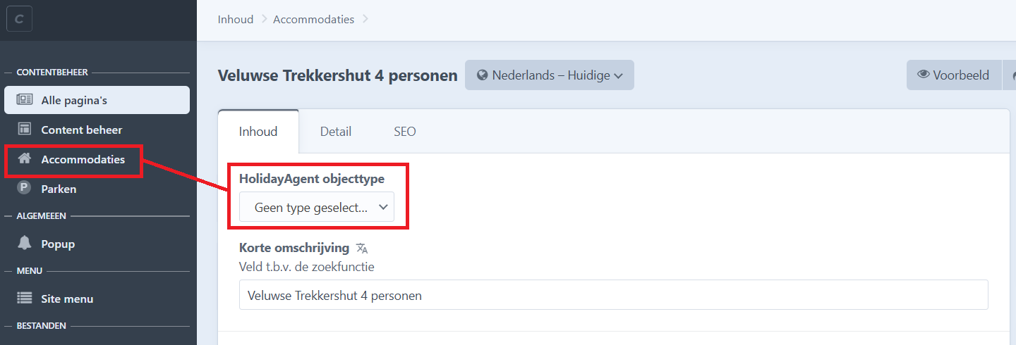 Heeft u een website via Holiday Media? Dan kunt u onder Accommodaties het bijbehorende HolidayAgent-objecttype koppelen en opslaan. Zie hieronder een voorbeeld van waar u dit kunt vinden: