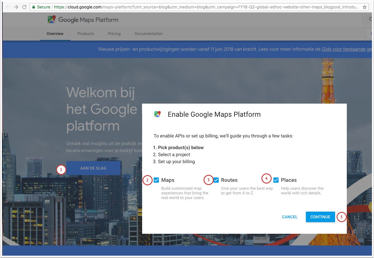 - Log in met je Google account, ga naar https://cloud.google.com/maps-platform/. Hier kies je voor "Aan de slag".