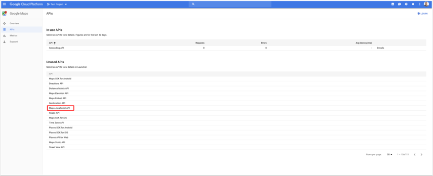Ook moeten we de "Maps Javascript API" op een zelfde manier "enablen" Dit doe je in het scherm zoals hieronder te zien is.