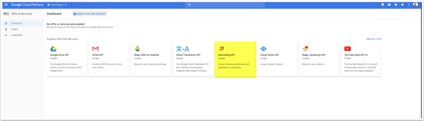 Na het afronden kom je in het console uit waar je je aangemaakte project kiest. Hier gaan we de diensten nogmaals activeren. Op het dashboard klikken we op "Geocoding API" en in de volgende stap op "enable"