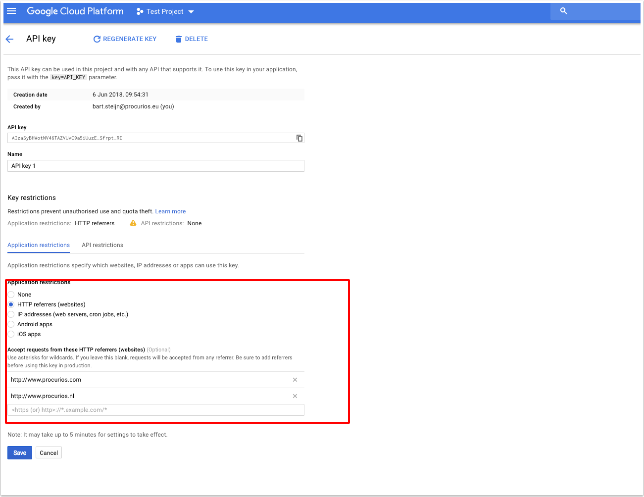 Omdat we niet willen dat anderen misbruik kunnen maken van deze key, gaan we het gebruik beperken. Klik hier voor op "restrict key". In het scherm hierna kiezen we onder "Application restrictions" voor "HTTP referrers (websites)" en geven we eronder de domeinen op die gebruik gaat maken van deze key. Dus alle url's van de door jullie gebruikte website(s) inclusief de backend url. Bijvoorbeeld: *.holidaymedia.nl, *.holiday.nl, www.holidaymedia.nl/*