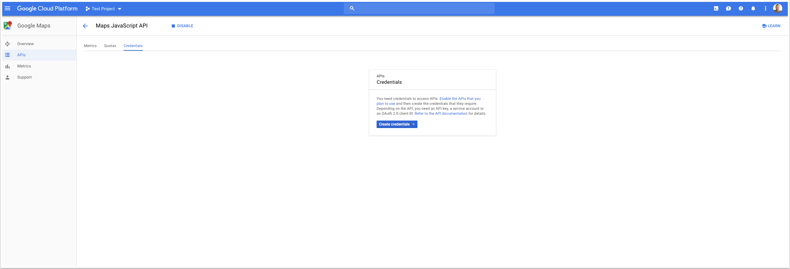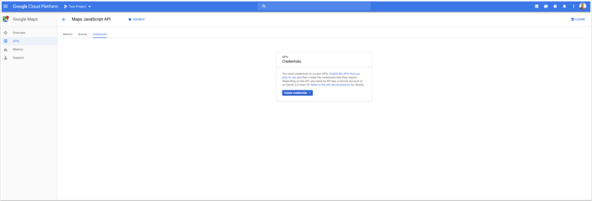 Na het enablen klikken je door naar "Credentials" en vervolgens op "create credentials".