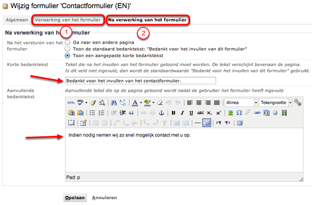- Bewerk het formulier om de bevestiging e-mails (1) en bedanktekst (2) te vertalen naar de gewenste taal.